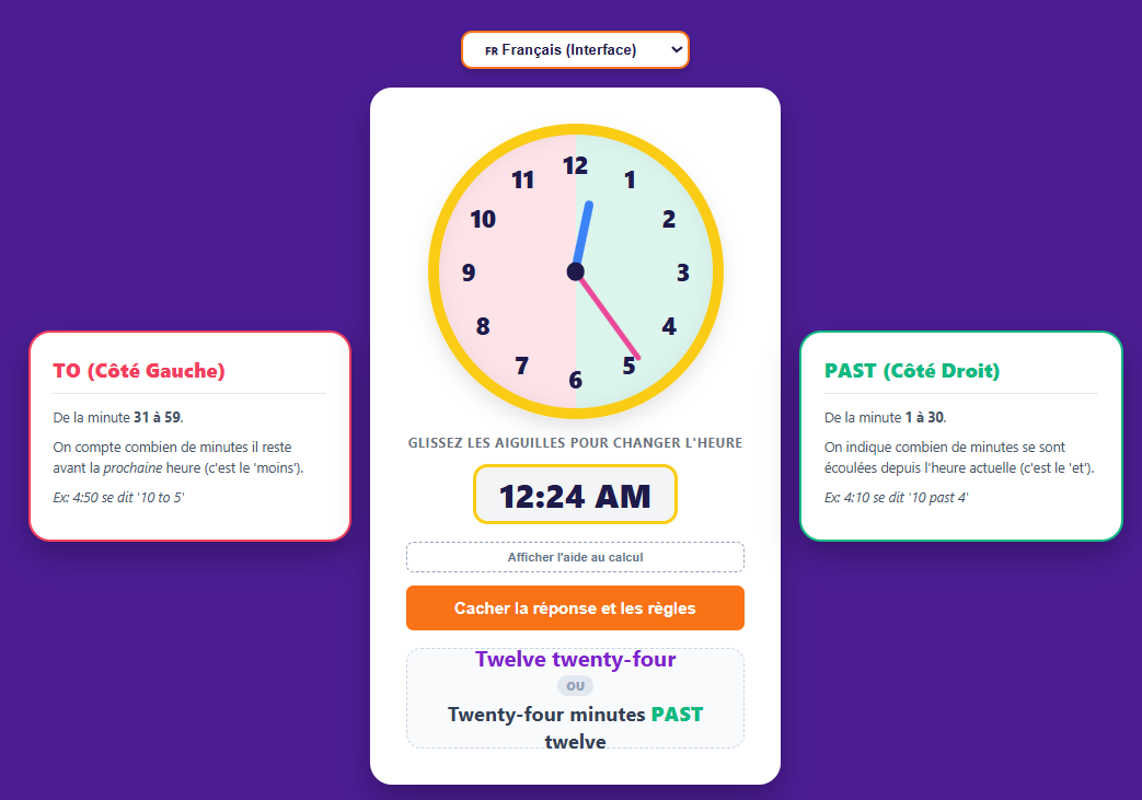 Interractive game to learn how to say the time in English, both the easy way and the hard way...